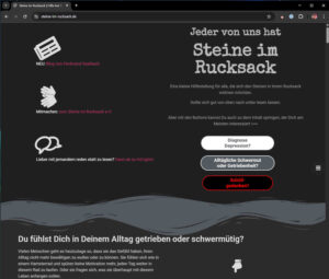 Im Februar 2020 hat die erste Version des Hilfsportals www.steine-im-rucksack.de das Licht der Welt erblickt. Ein Projekt, das aus Verzweiflung entstanden ist. Eigentlich wollte Ferdinand Saalbach offizielle Stellen dazu auffordern, jedem Menschen, der mit Depression zu tun hat, einen Info-Flyer in die Hand zu geben, auf dem die wichtigsten Dinge erklärt werden. Das sei aber zu viel Mühe, hört er allerorten. Daher hat er dann kurzerhand einfach eine Webseite erstellt, auf der er die in seinen Augen wichtigsten Dinge zusammengestellt hat.
